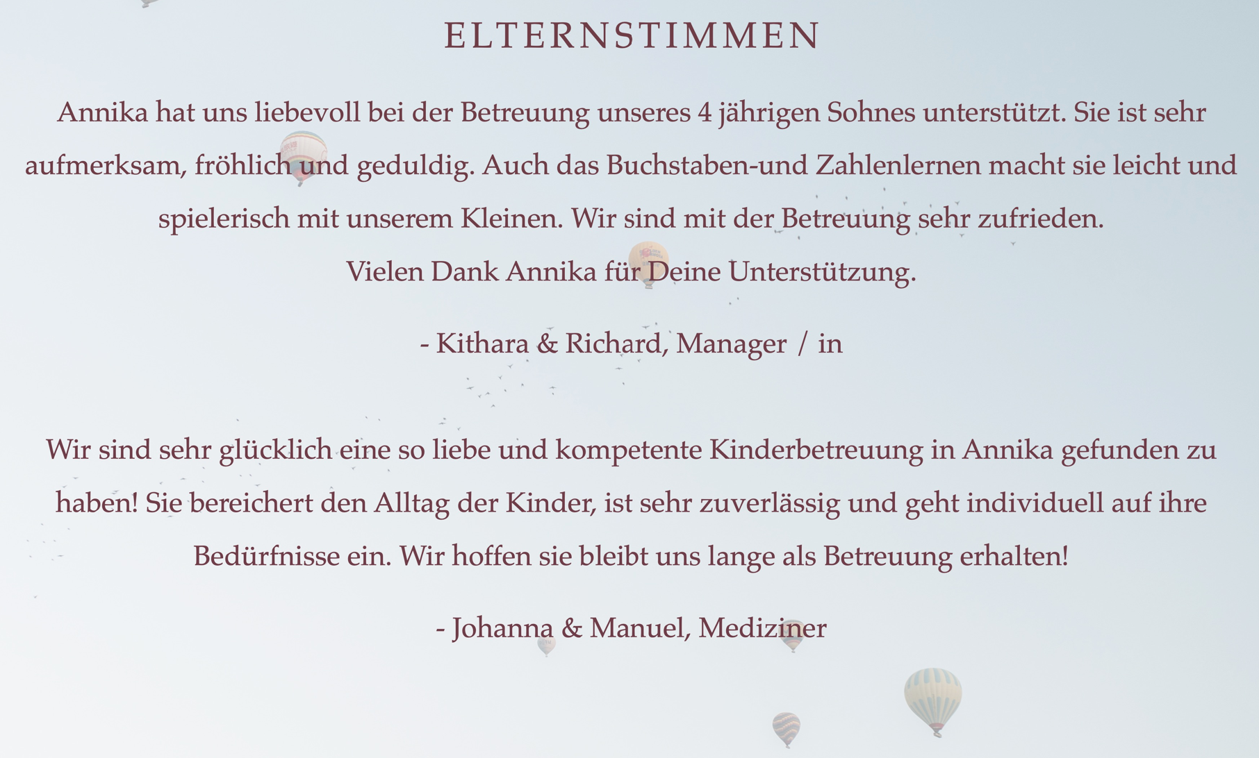 Mit unserem breiten Repertoire an PädagogInnen und Betreuungsangebot unterstützen wir gerne bei jeder Art von Bedarf – egal ob wöchentliche Betreuung, Krankheitsbetreuung, Urlaubsbegleitung, Hochzeits- oder Eventbetreuung.